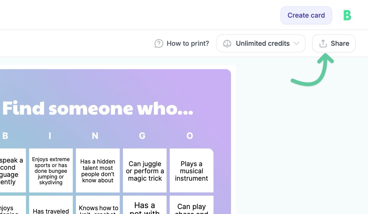 • Share as a Template: Share your bingo card design as a template! Simply provide a link, and anyone who visits can quickly create a copy, edit it, print, or play online in their own account—perfect for sharing ideas and customizing games.