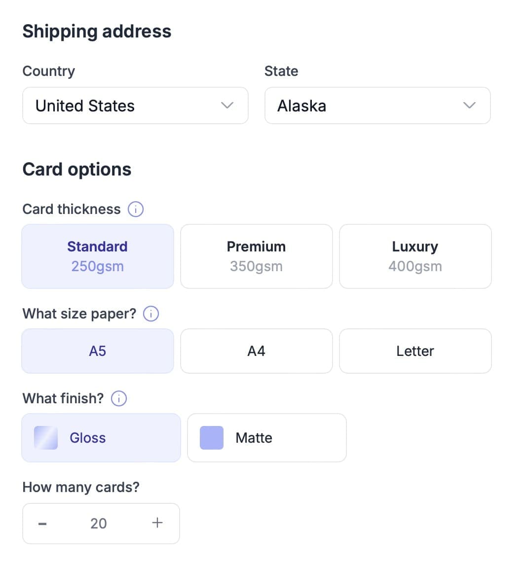 - Choose card quantity: You can order a minimum of 20 cards, and up to a maximum of 1,000 cards.